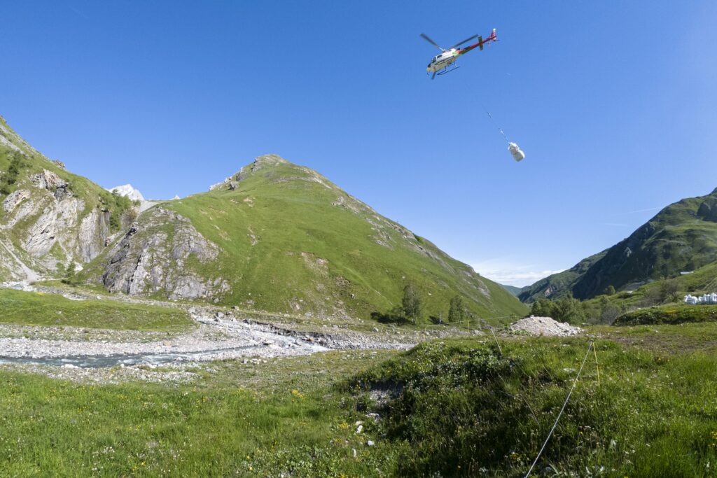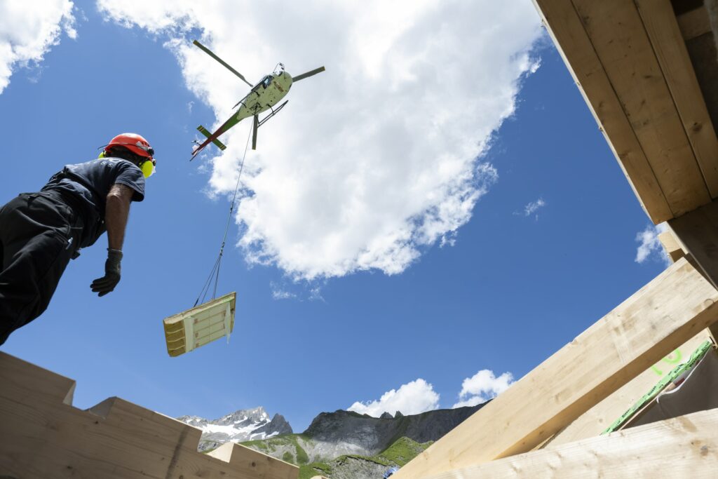 Lors d’une construction en montagne, l’héliportage est souvent utilisé pour faciliter l’approvisionnement des opérations.