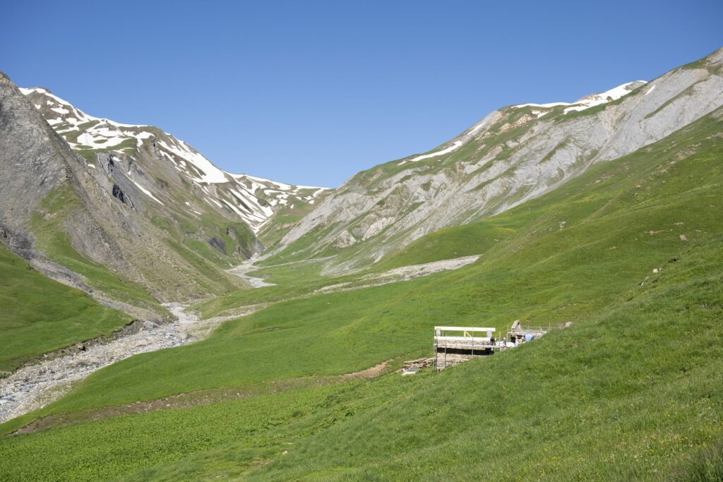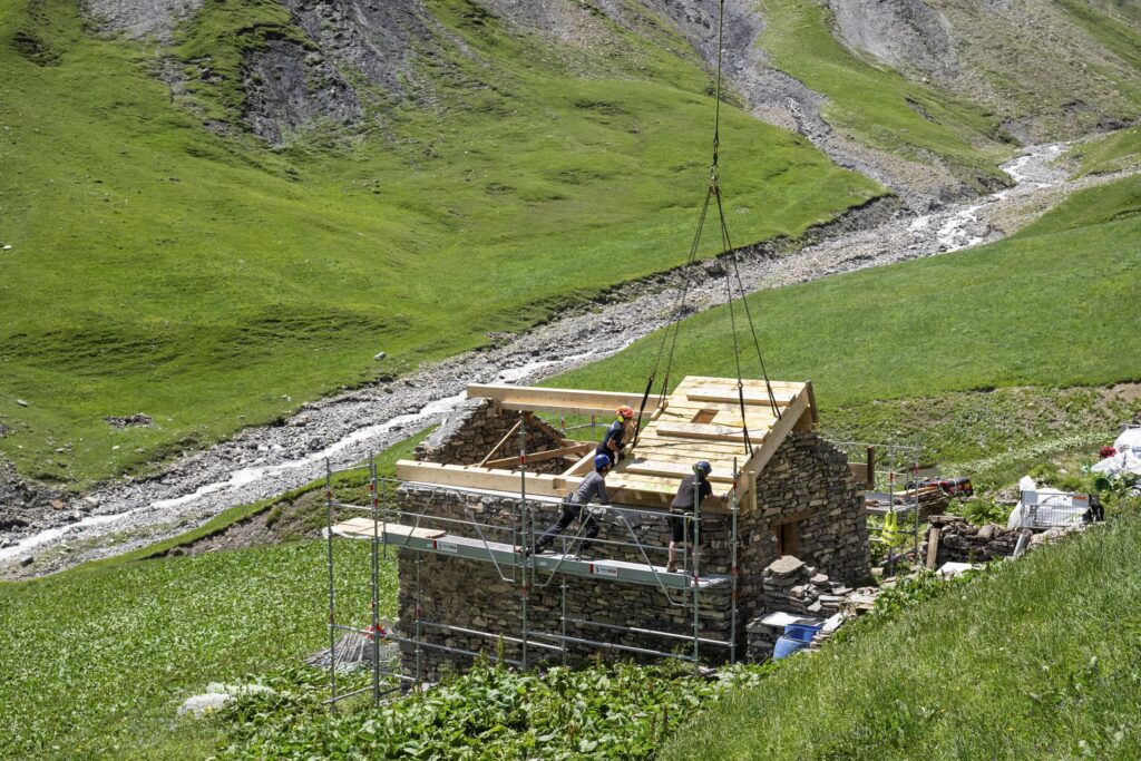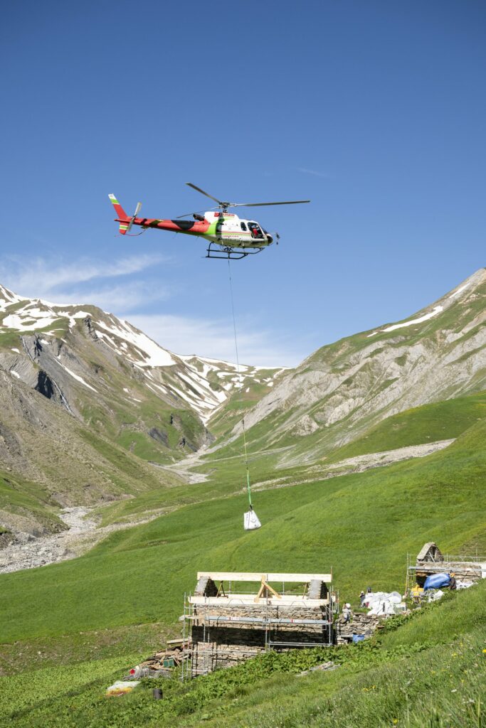 Héliportage pour une construction en montagne : reportage photographique pour la rénovation de refuges d’alpage en Savoie.