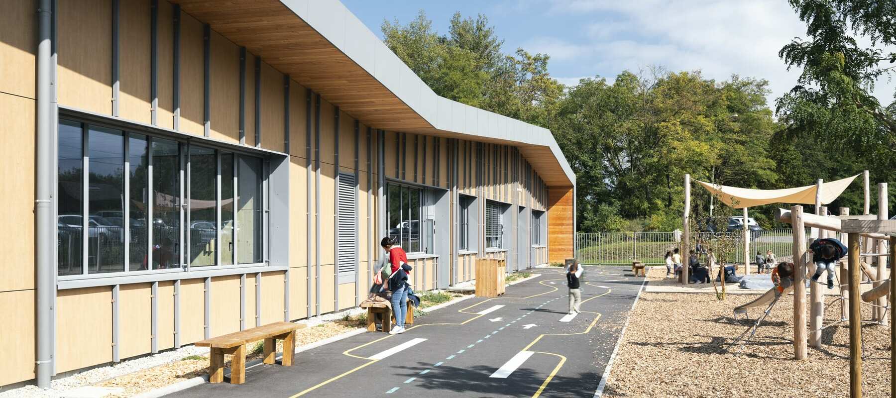 Reportage complet intérieur/extérieur sur la construction de l’annexe. Une vue drone met en évidence l’intégration du nouveau bâtiment dans le quartier (cabinet Groupe Eole), point important du programme. Portfolio.