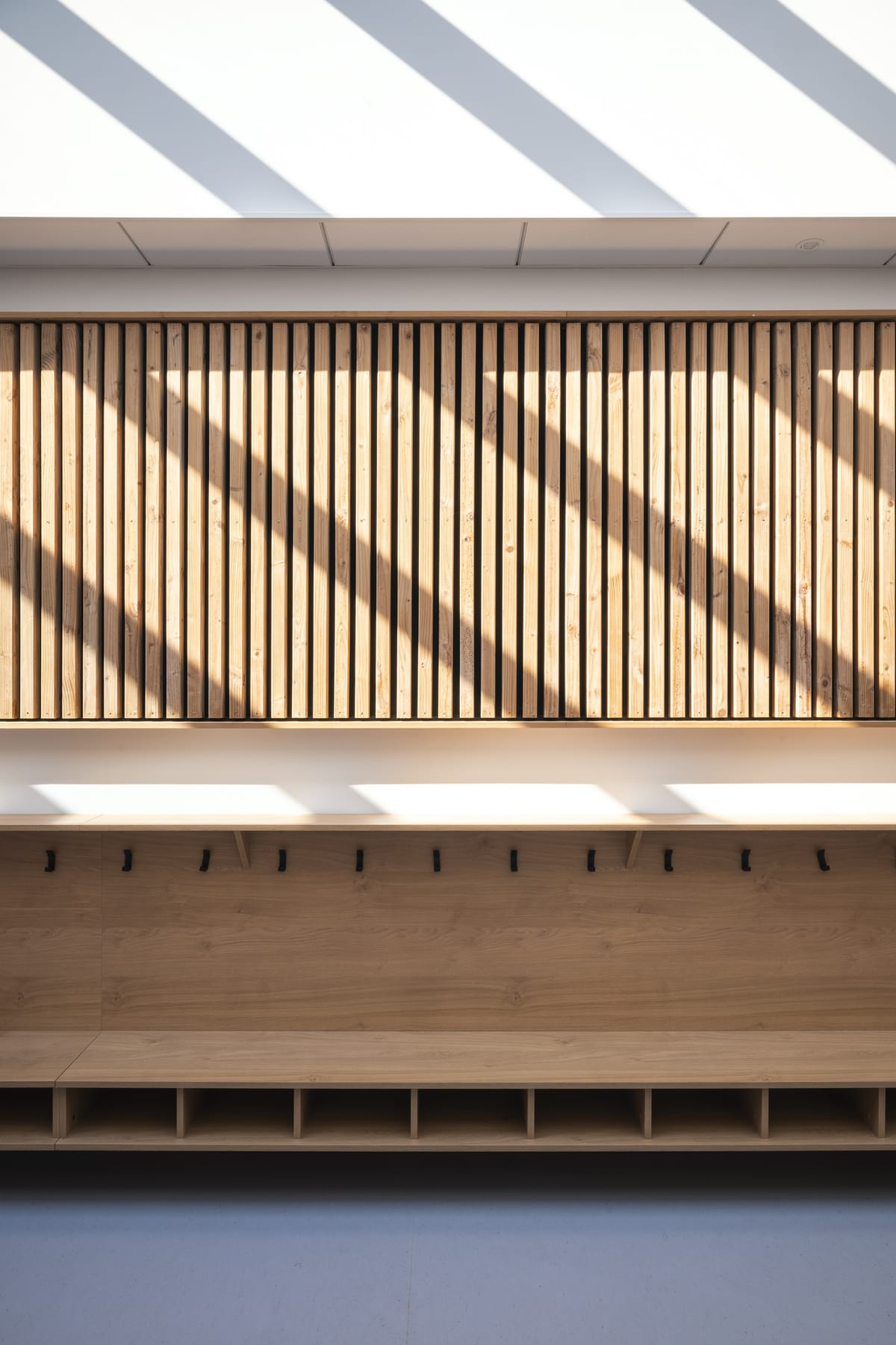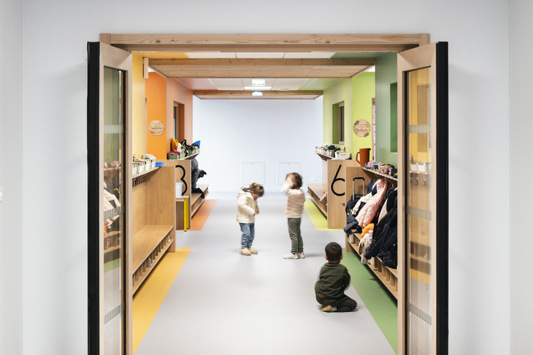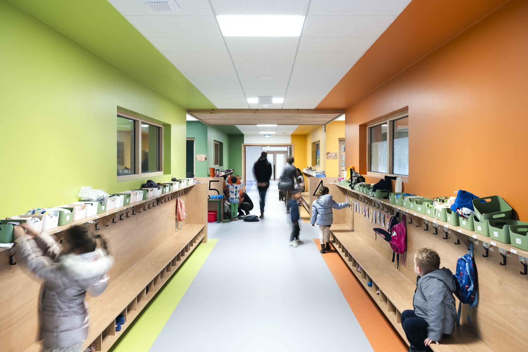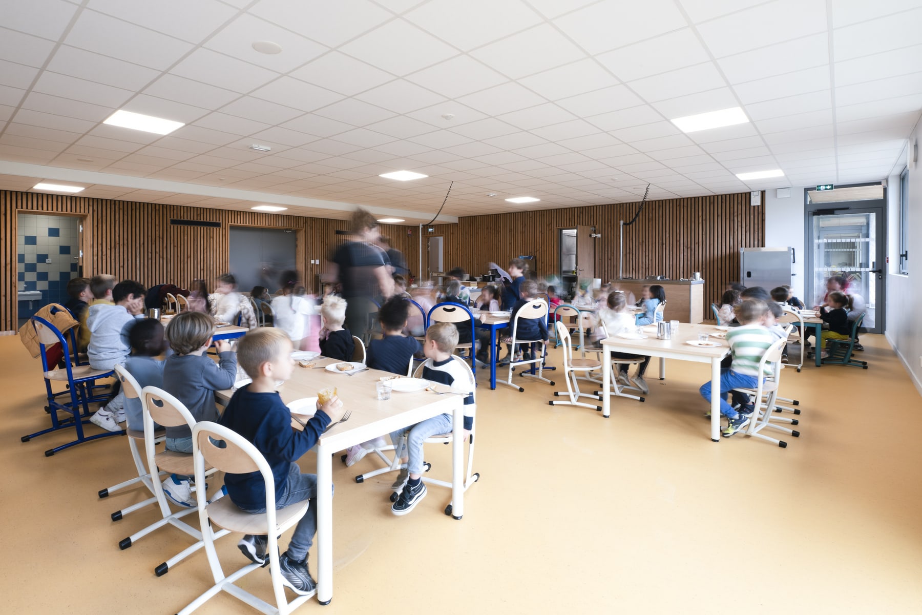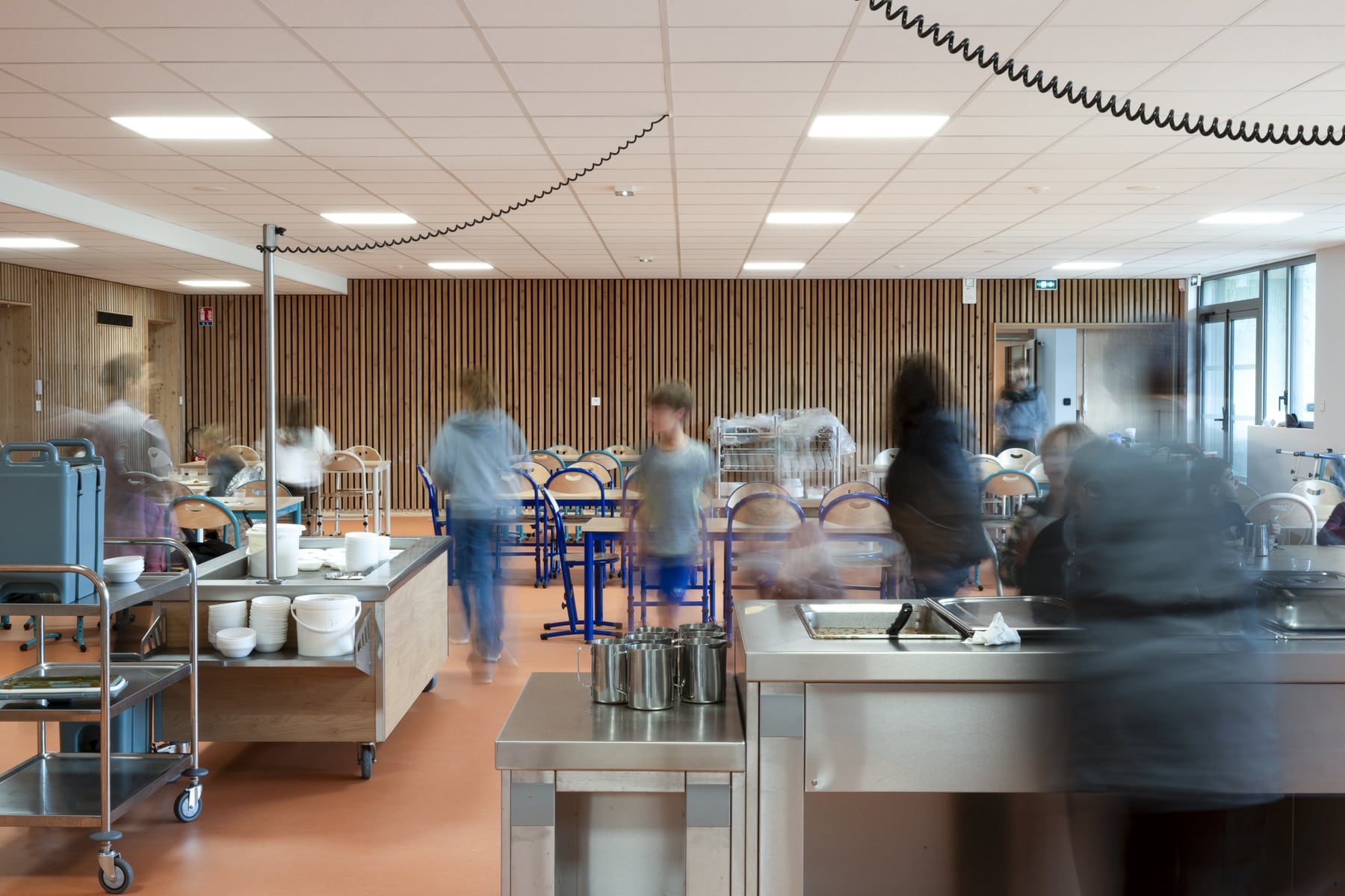 Le reportage porte une attention particulière à l’usage. Les silhouettes floues apportent une présence discrète qui rend les lieux plus vivants, sans détourner l’attention des espaces eux-mêmes. Cette approche permet de montrer un bâtiment en fonctionnement, tout en conservant une lecture sobre et maîtrisée de l’architecture.
