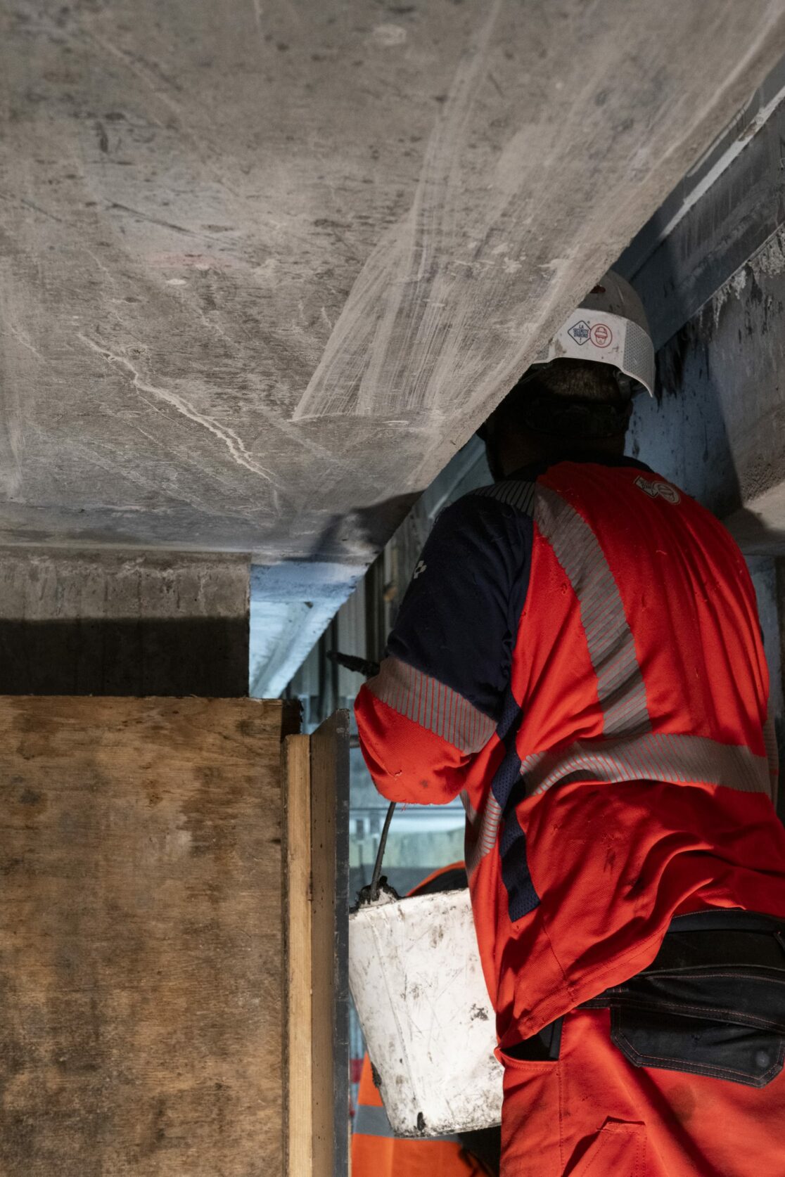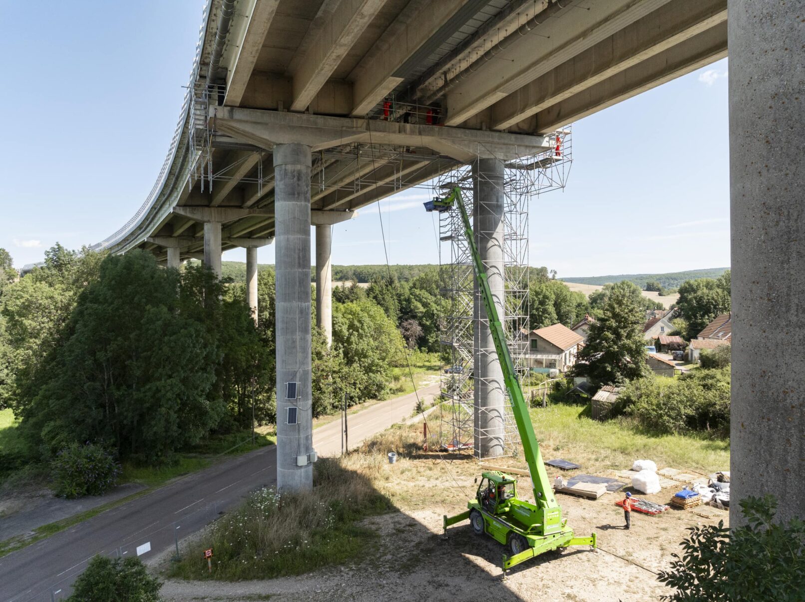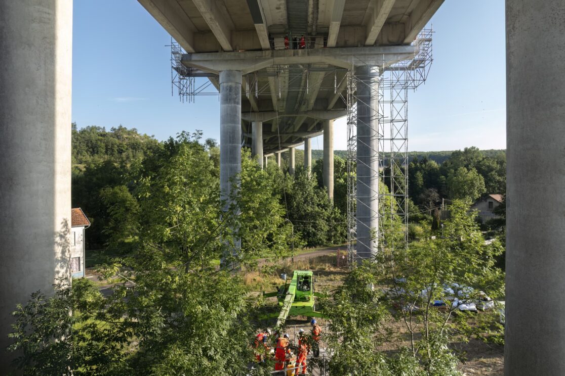 Le chantier consiste à couler une protection en tête de certains poutres du viaduc pour les protéger. Le matériau utilisé est du BFUP : Béton Fibré à Ultra hautes Performances. Des installations provisoires en échafaudage ont été installées pour accéder à la zone de coulage.