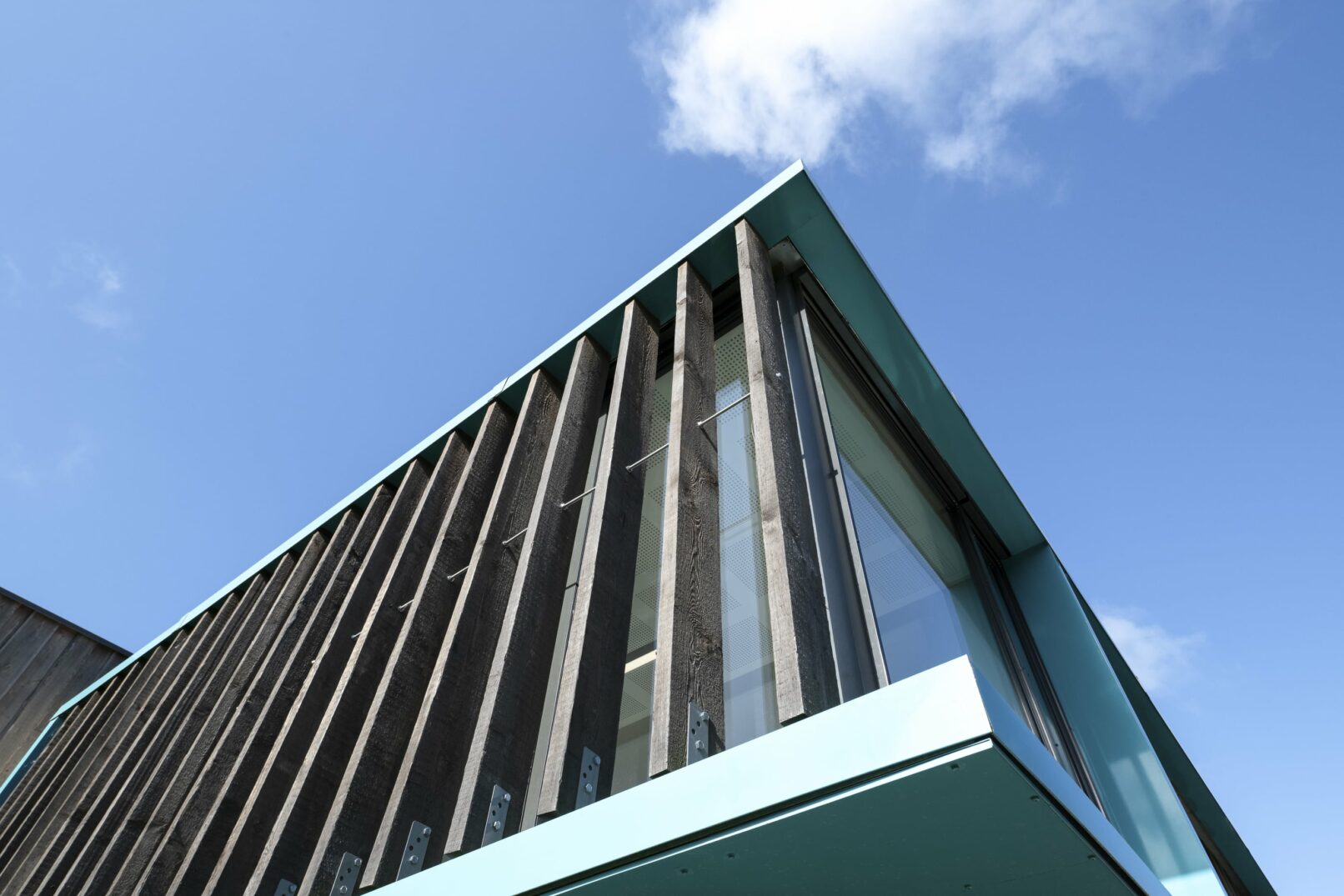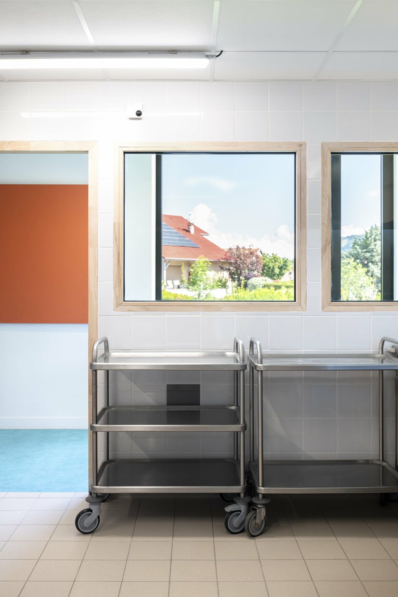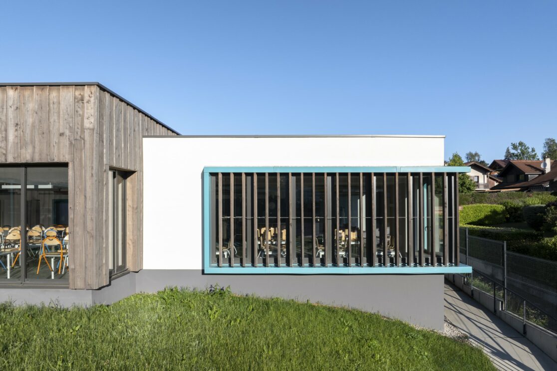 Parole des concepteurs – Groupe Eole : « Les salles de repas bénéficient de larges ouvertures sur l’extérieur, au moyen de baies cadrées par entourage en métal laqué coloré, formant excroissances sur façades et assises exploitables dans les salles. L’apport de soleil et l’intimité des espaces sont régulés par brise-soleil verticaux en bois massif. Du bardage en planche mélèze avec écorce marque le volume central. »