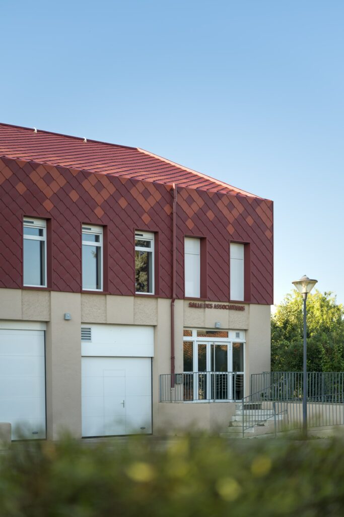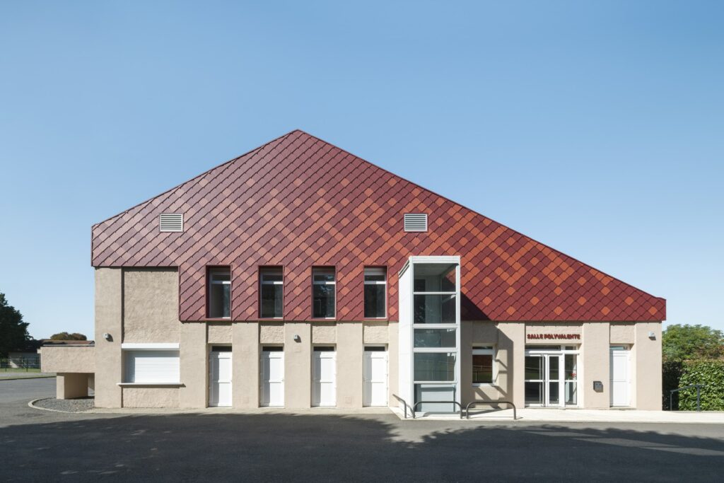 Cette salle polyvalente a été rénovée, la toiture et les façades sont traitées en produits PREFA.