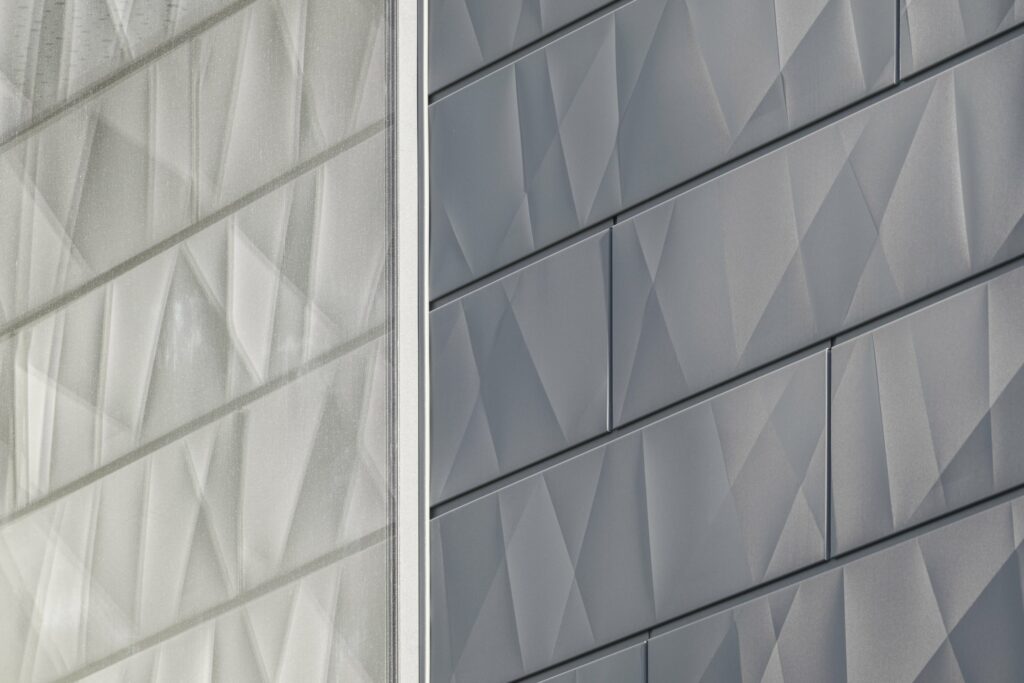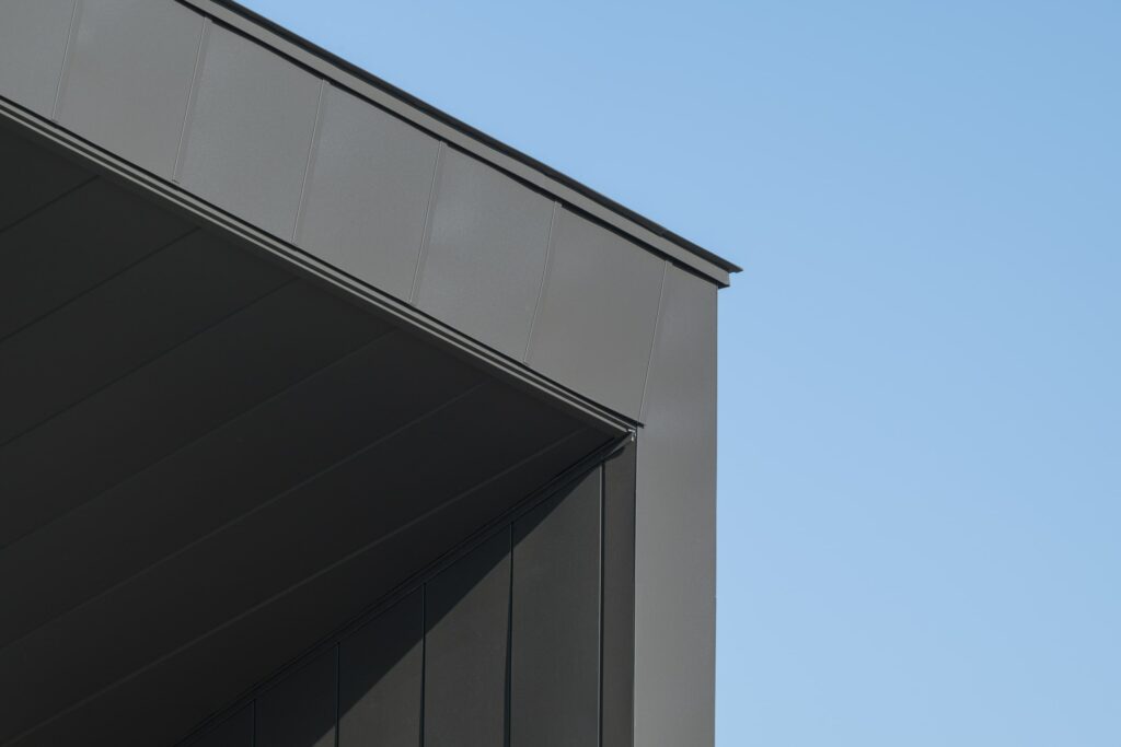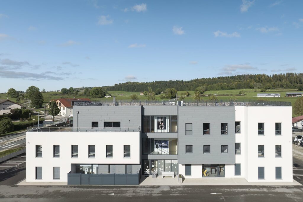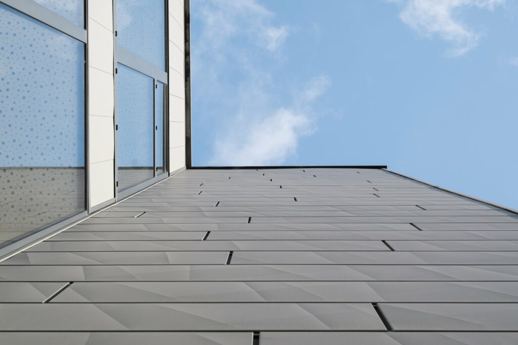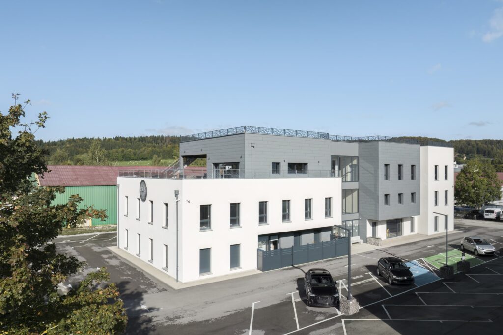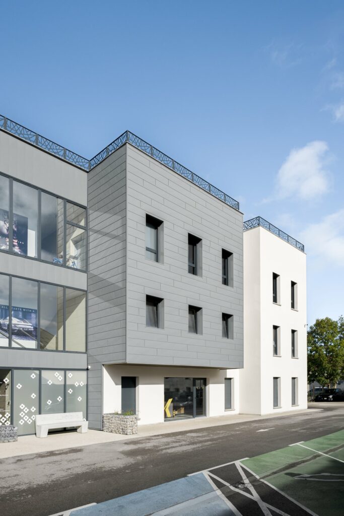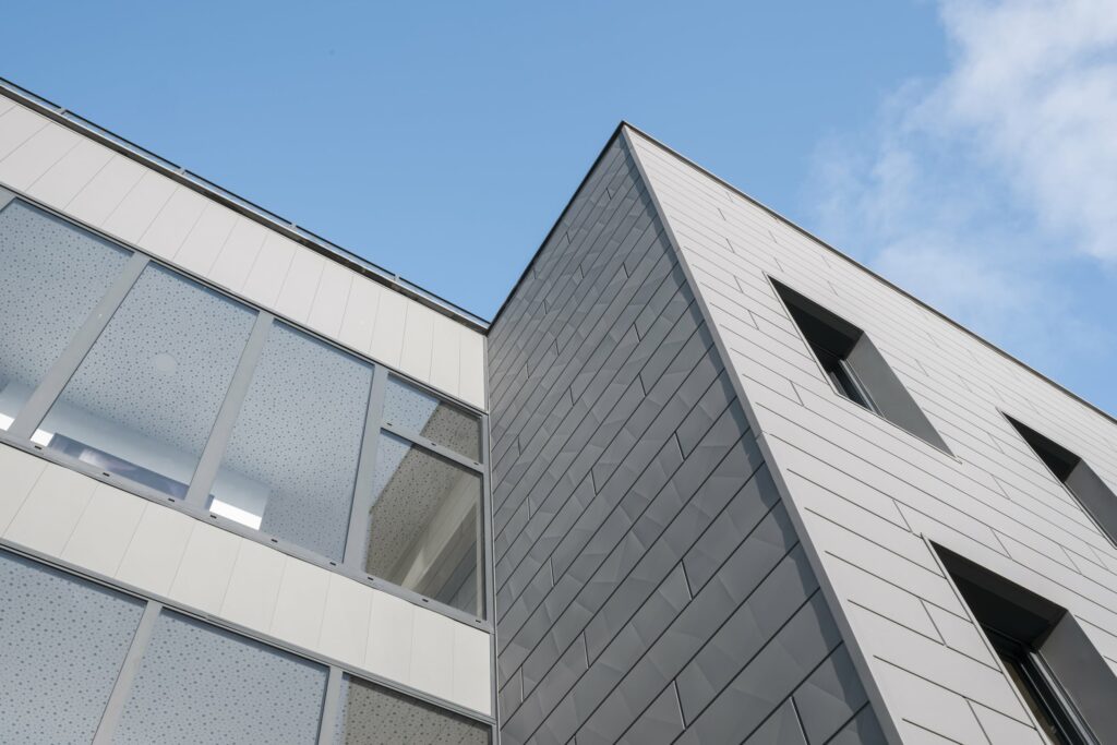 Construction d’un immeuble tertiaire où les produits PREFA sont en partis en façade.