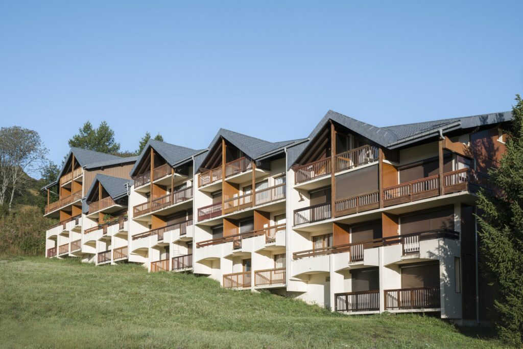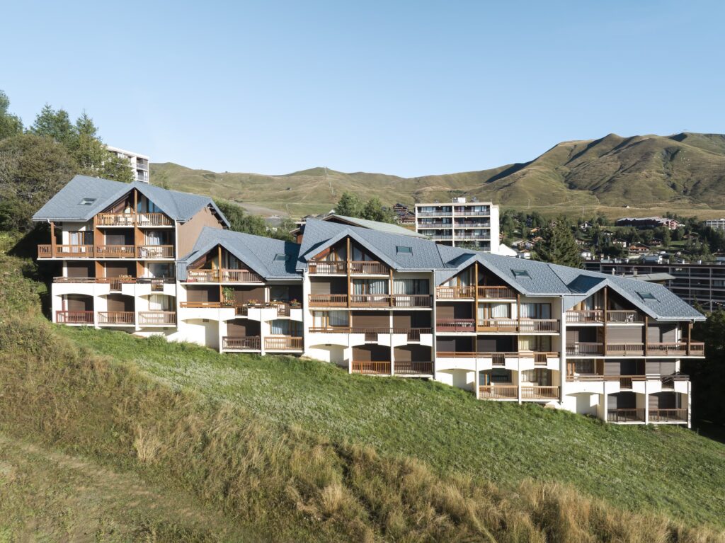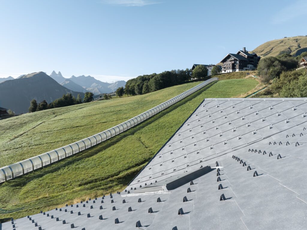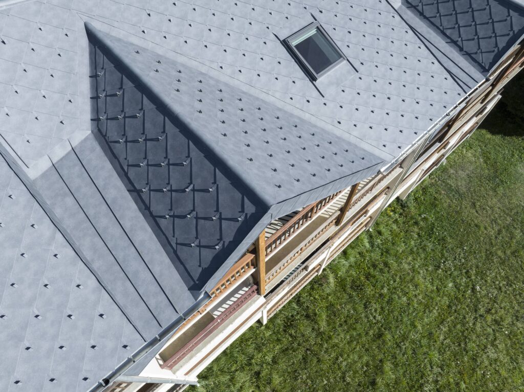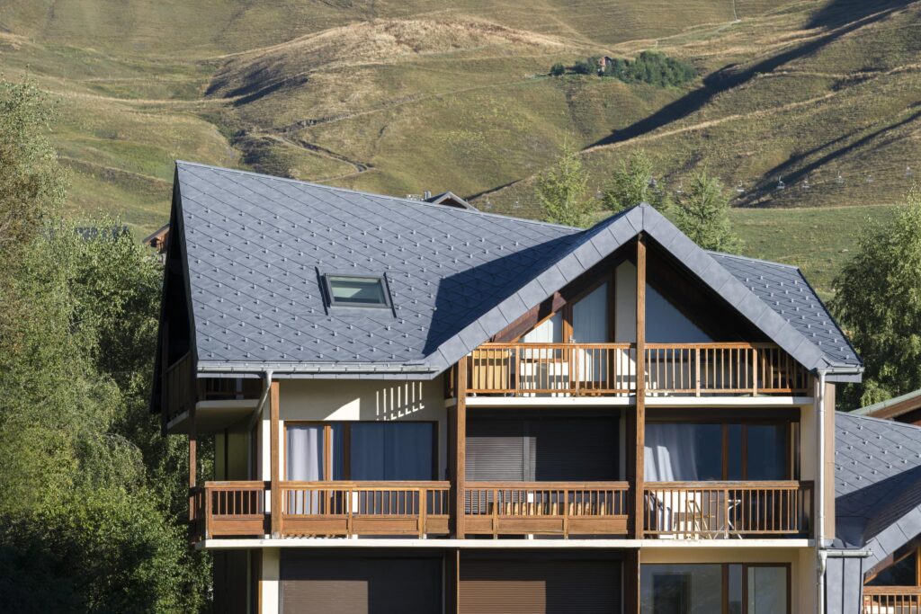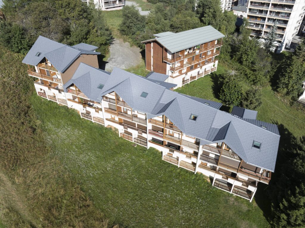 Rénovation d’un immeuble de logements en station de ski, les produits PREFA sont présents en toiture.