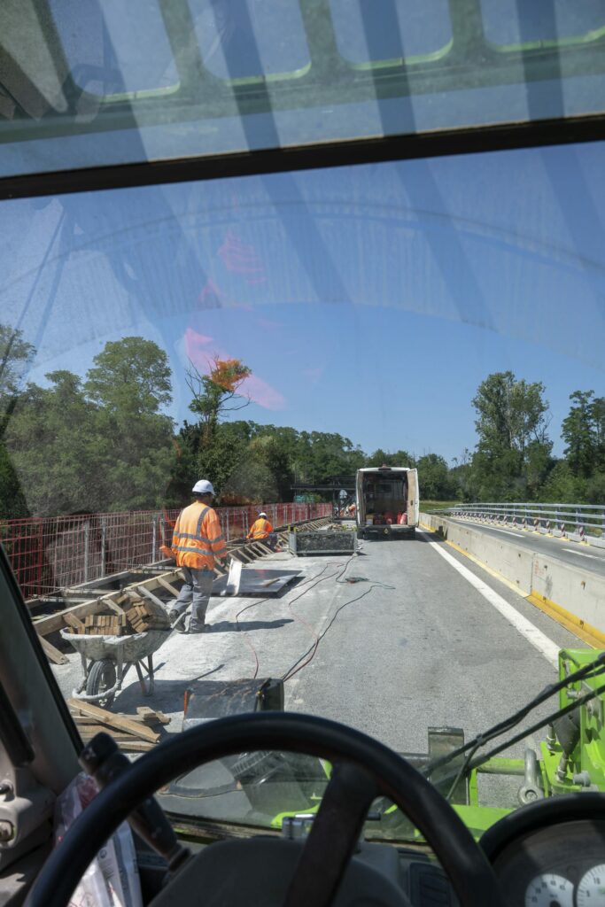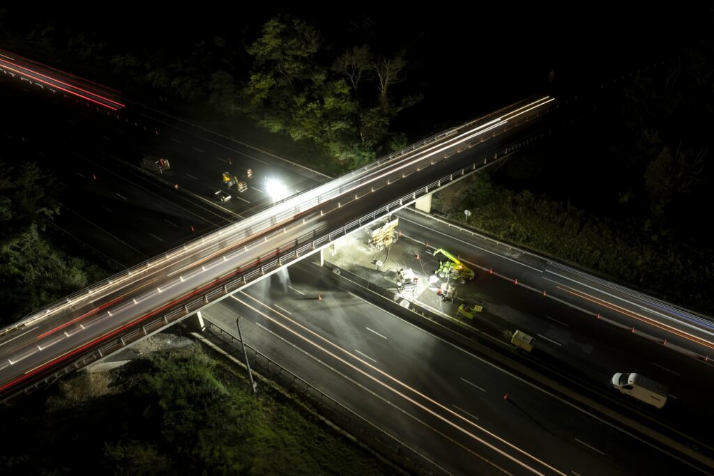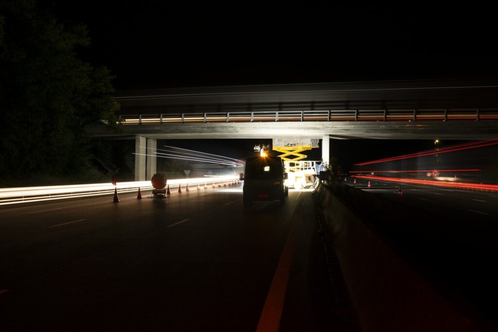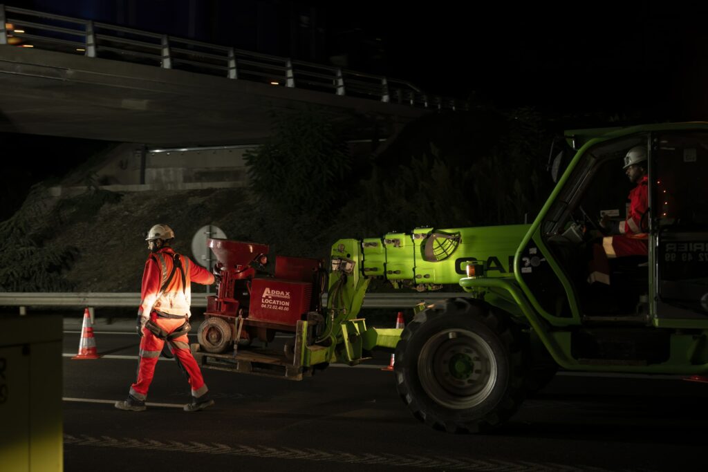 Lors de ce reportage travaux sur autoroute, j’ai recherché à réaliser des prises de vue qui illustraient les différentes étapes du phasage. La mise en lumière du travail des équipes mais aussi du matériel utilisé pour ce type d’opération. La nuit, j’ai pu jouer avec les lumières des véhicules circulants sur l’autoroute pour montrer la co-activité de ces travaux.