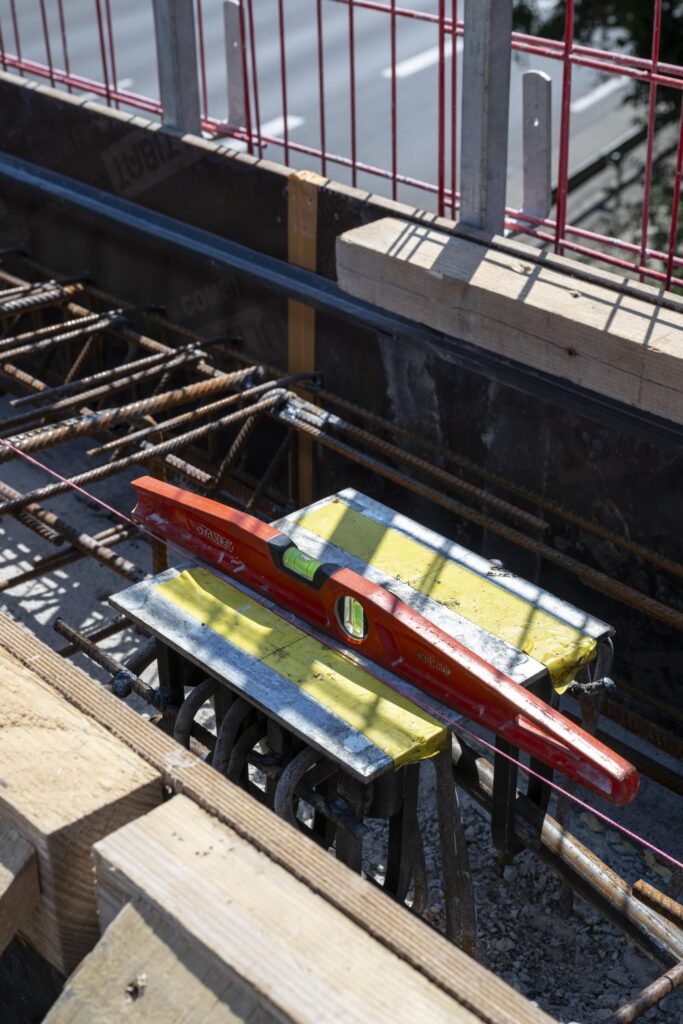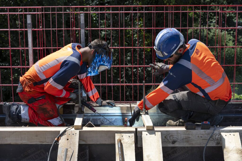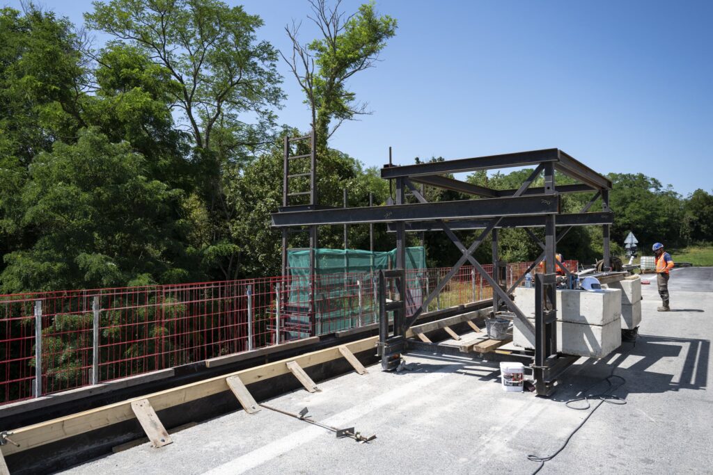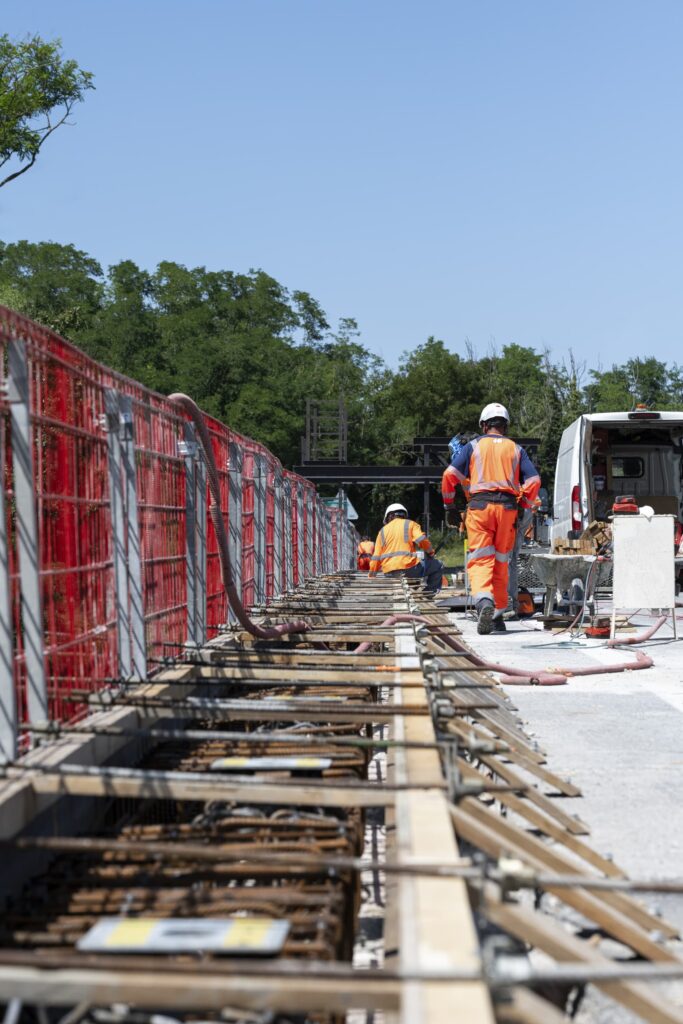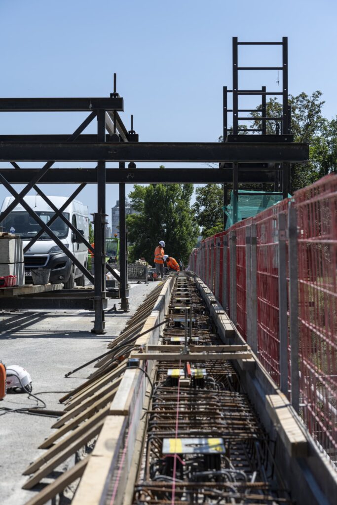 La première en travaux de jour sur le coffrage et le ferraillage des rives du pont. Un portique a été construit spécialement pour réaliser des travaux sur le tablier.