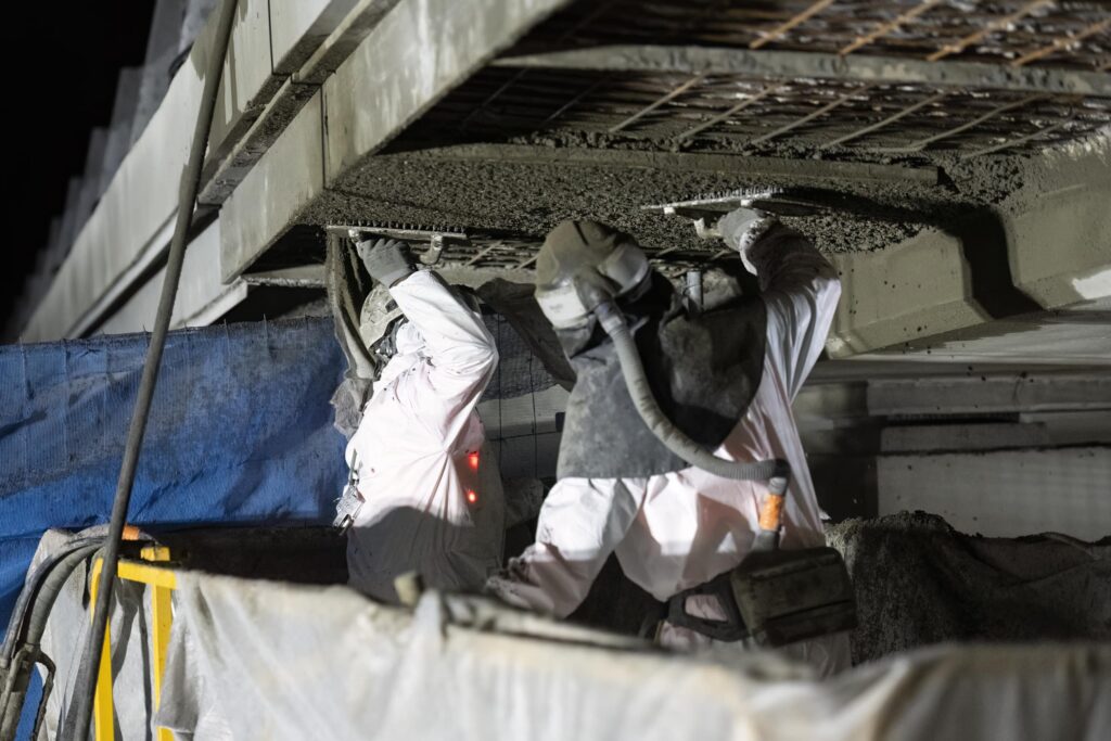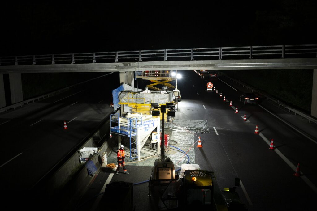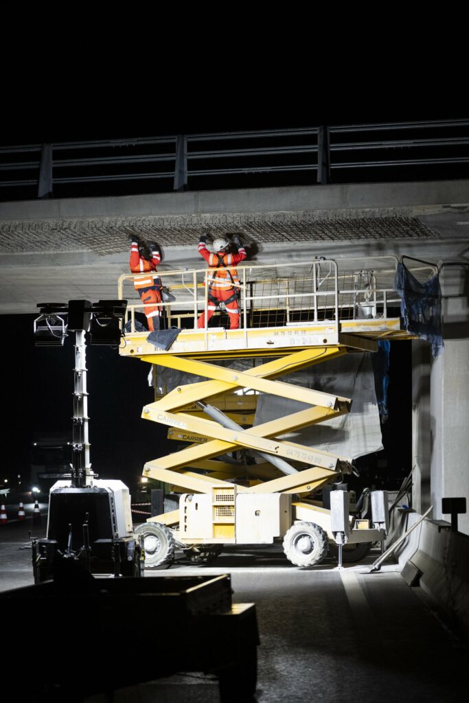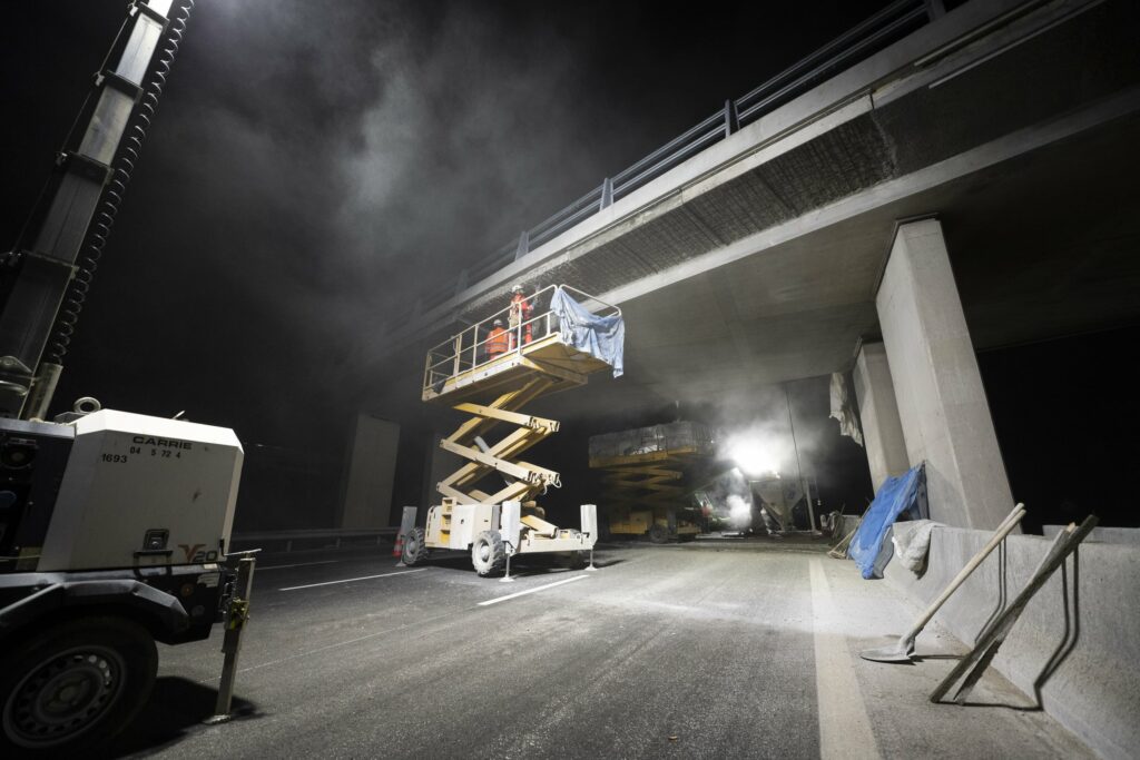 Par la suite, le reportage consistait à suivre l’équipe en travaux de nuit. La projection du béton a été réalisée en sous-face du pont après purge des éléments de béton non adhérents. Ces travaux sont réalisés après la pose du balisage par l’exploitant de l’autoroute pour sécuriser l’intervention des compagnons.