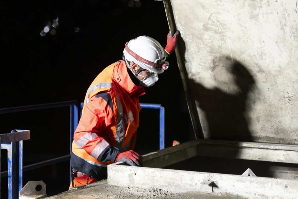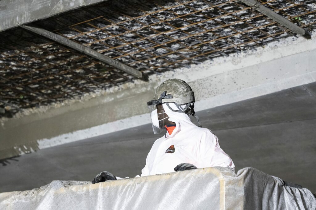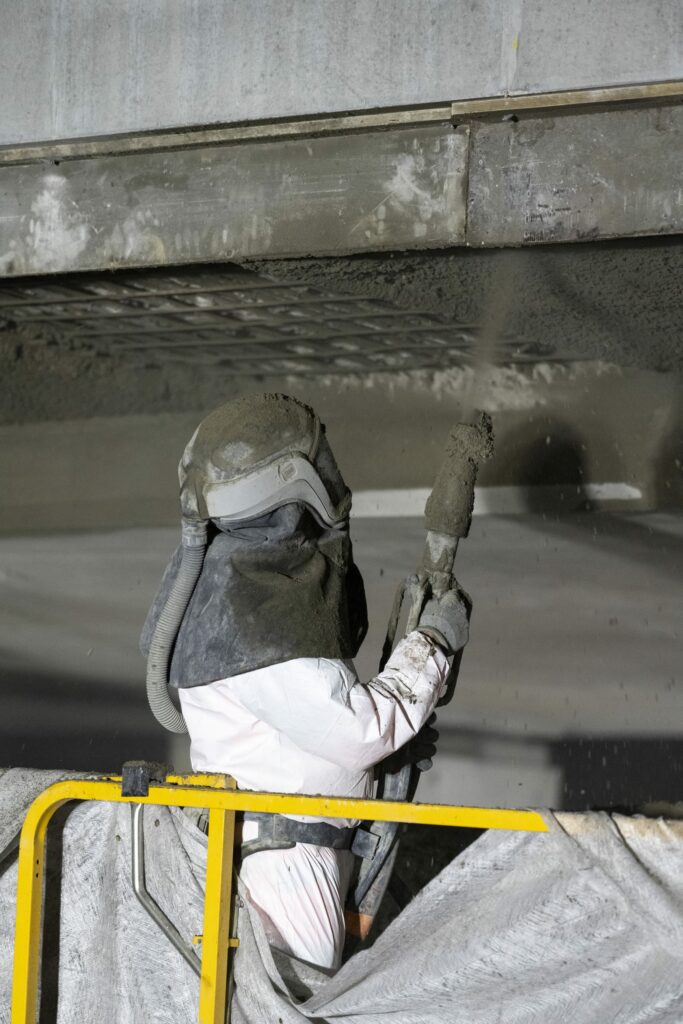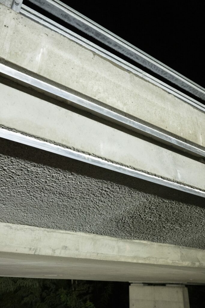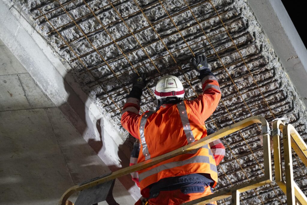 Par la suite, le reportage consistait à suivre l’équipe en travaux de nuit. La projection du béton a été réalisée en sous-face du pont après purge des éléments de béton non adhérents. Ces travaux sont réalisés après la pose du balisage par l’exploitant de l’autoroute pour sécuriser l’intervention des compagnons.